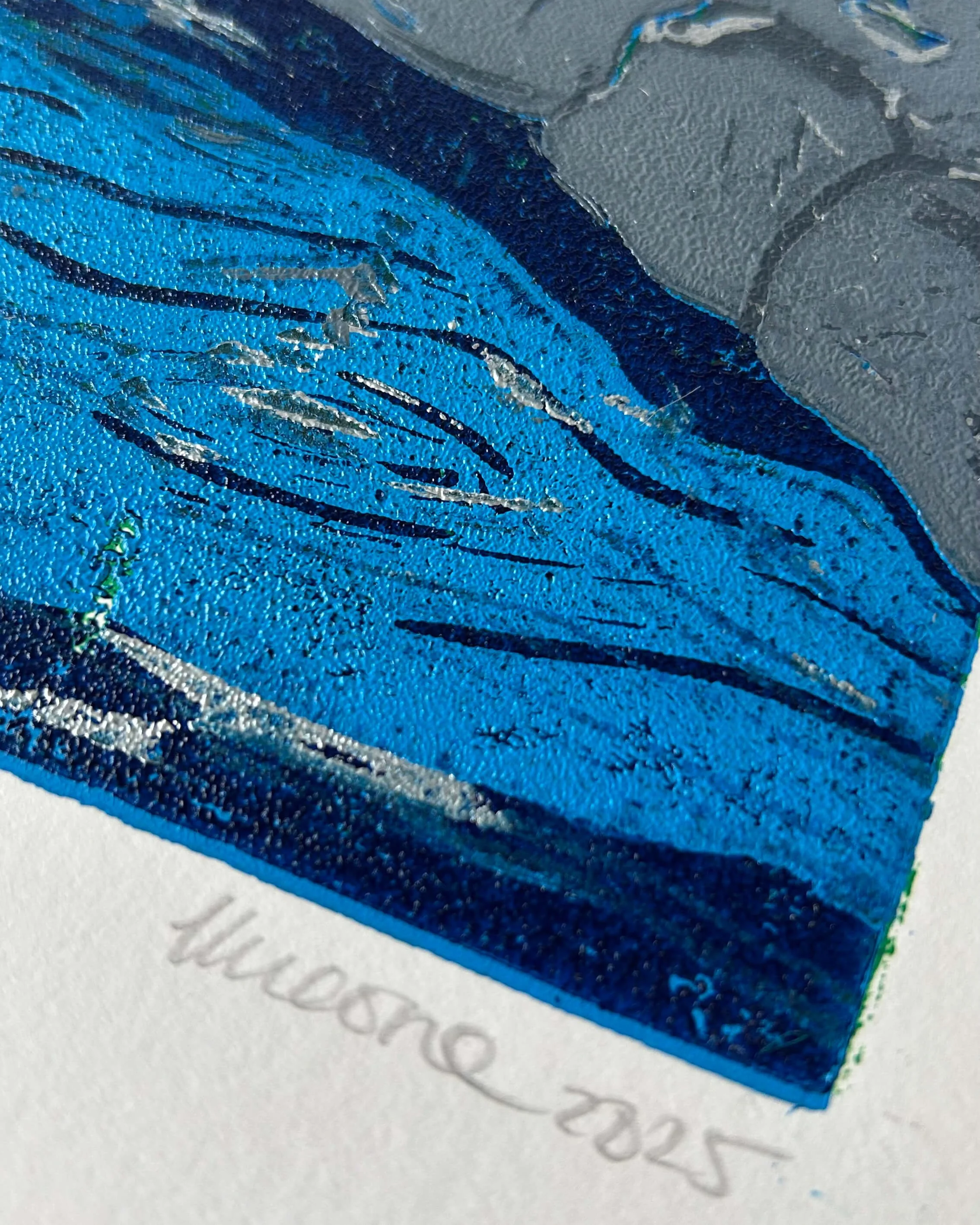 The piece is created with nine layers of oil-based ink, each one hand-pulled on archival paper. That process makes every print unique, with its own subtleties and surface textures — a true reflection of the unpredictable ripples and rhythms of the natural world.