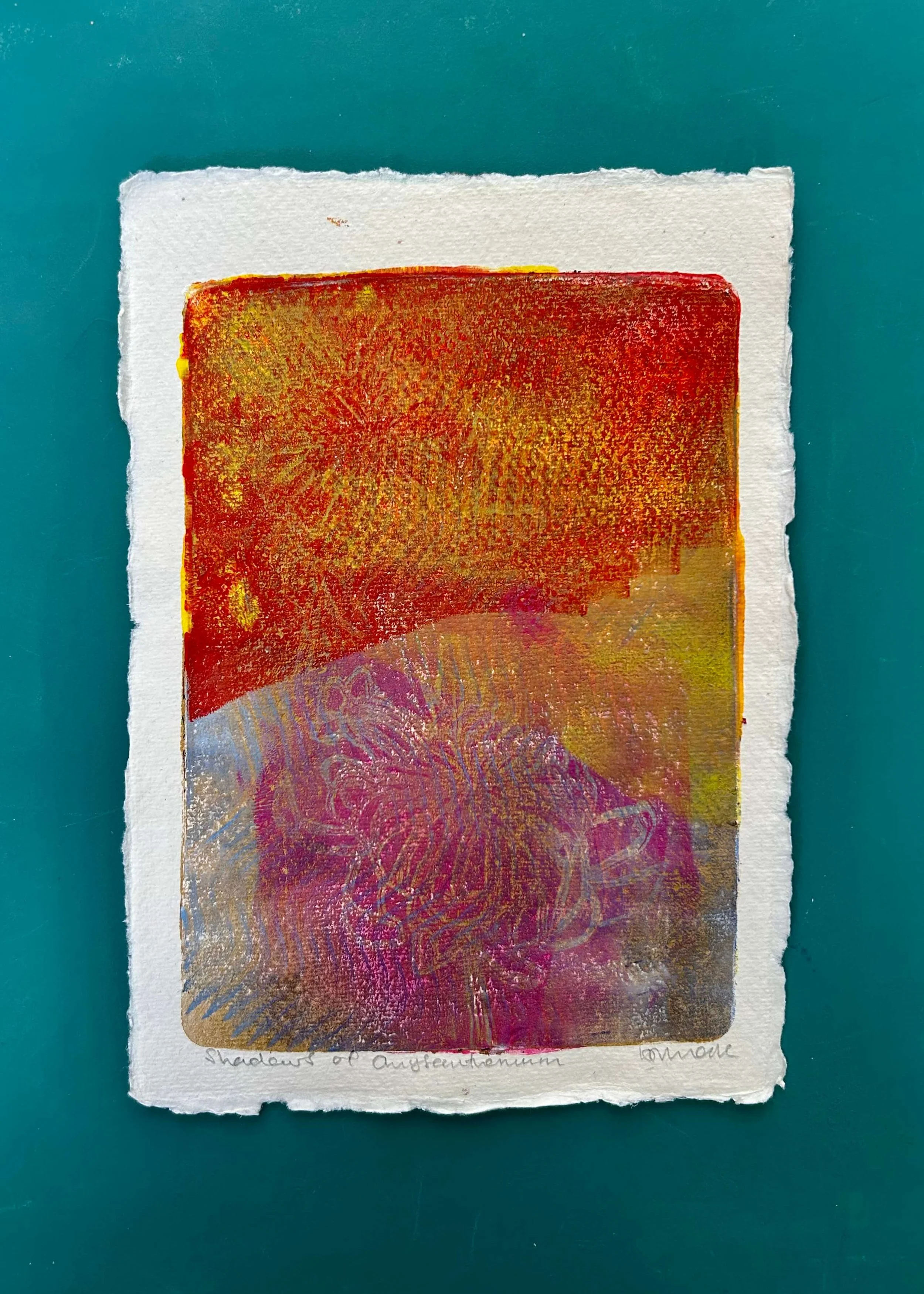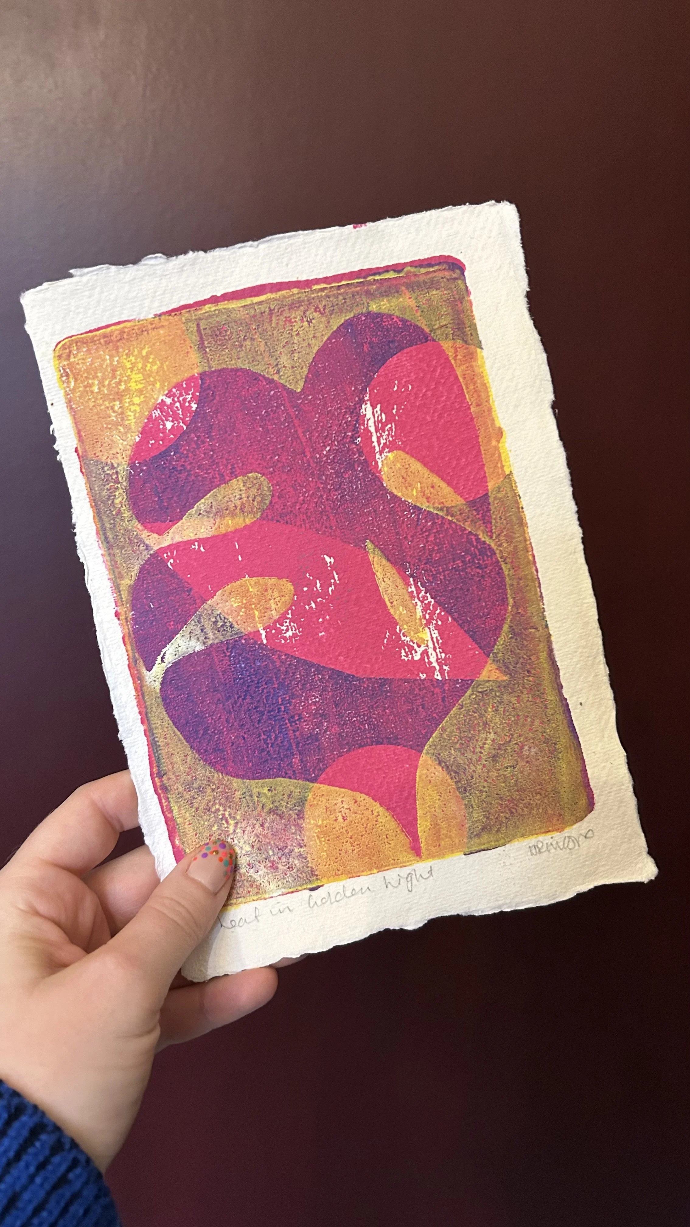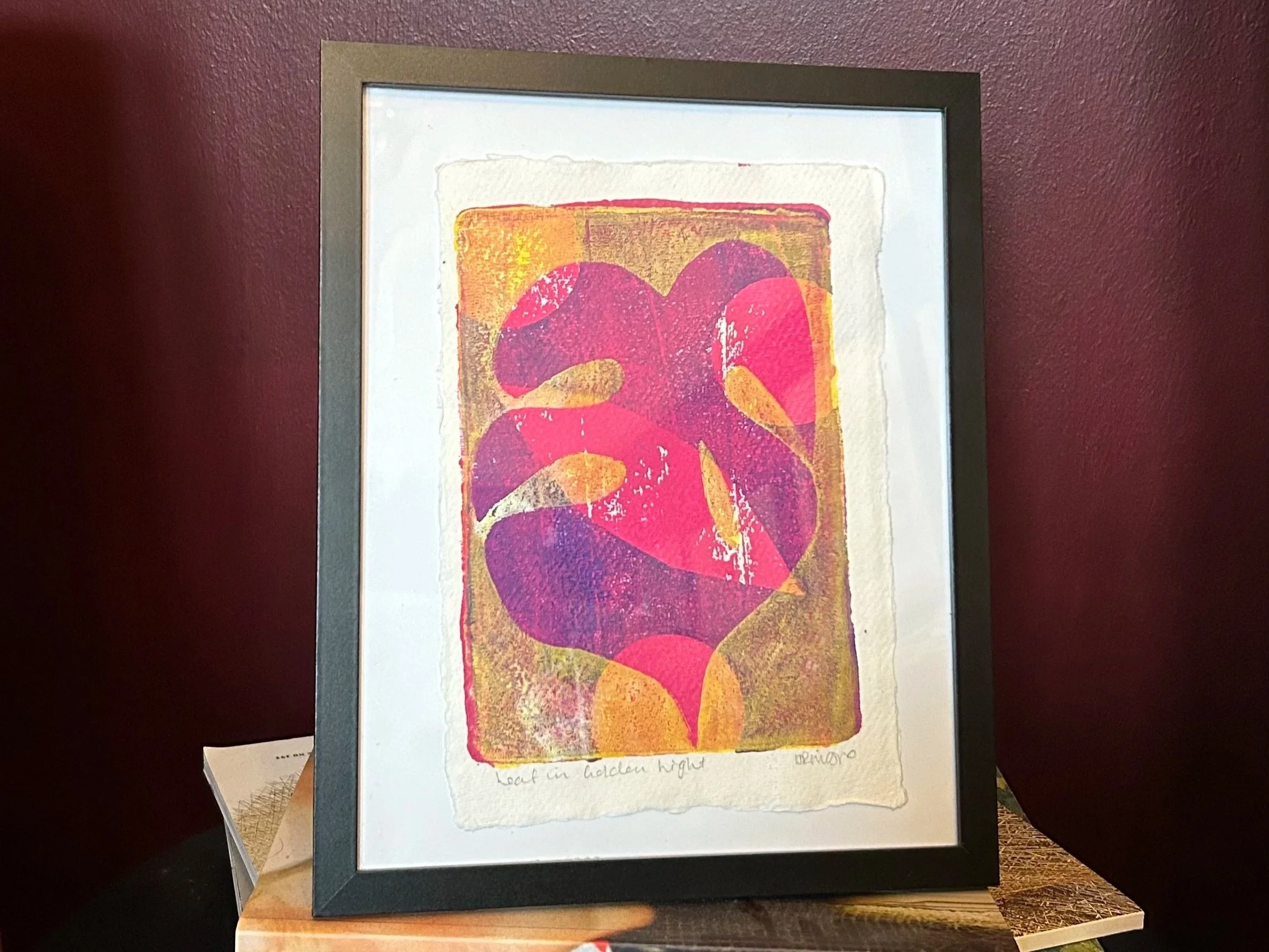 Dappled Leaves - Original Monotype Print of pointy leaves in deep green, hot pink, royal blue and deep orange - acrylic and heavy weight paper.