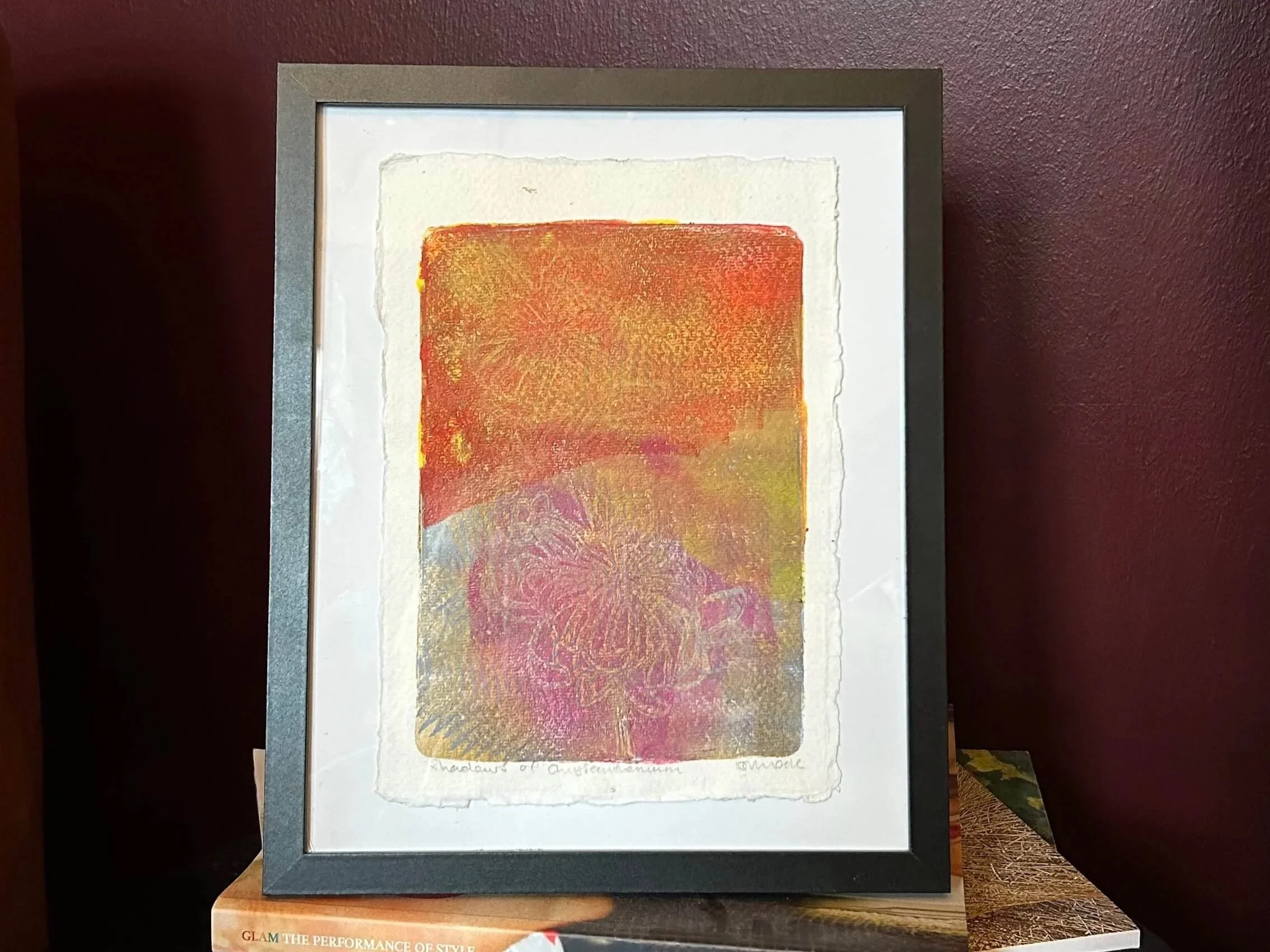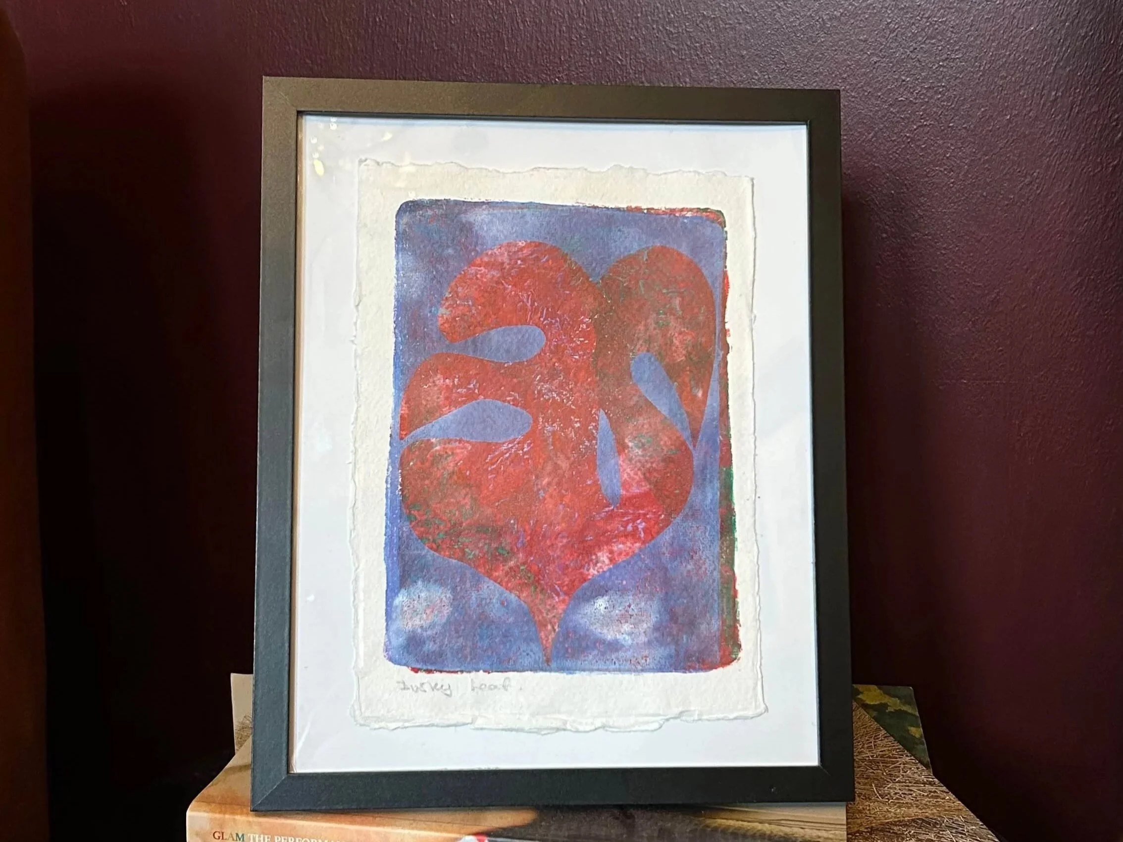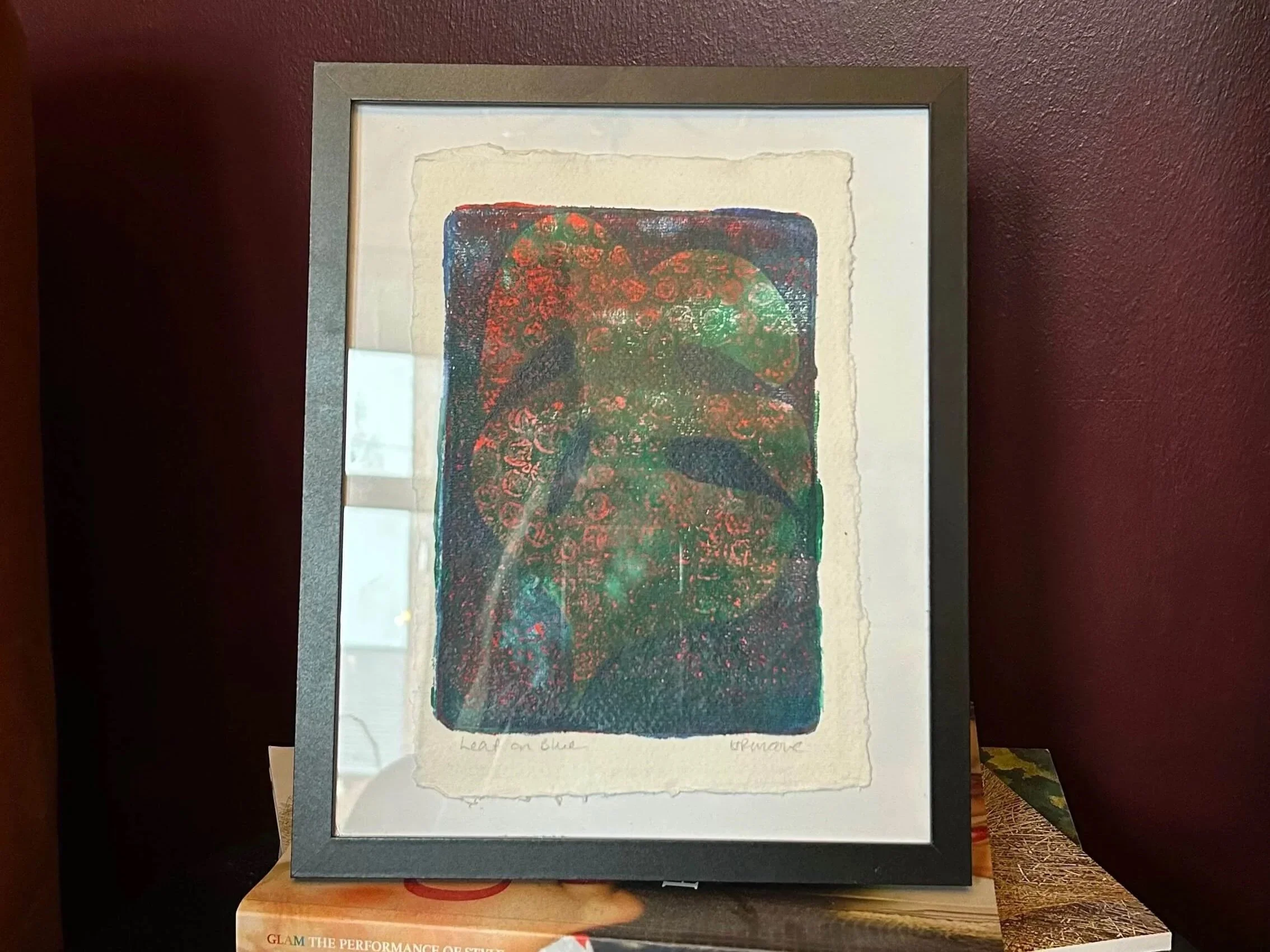 Dappled Leaves - Original Monotype Print of pointy leaves in deep green, hot pink, royal blue and deep orange - acrylic and heavy weight paper.